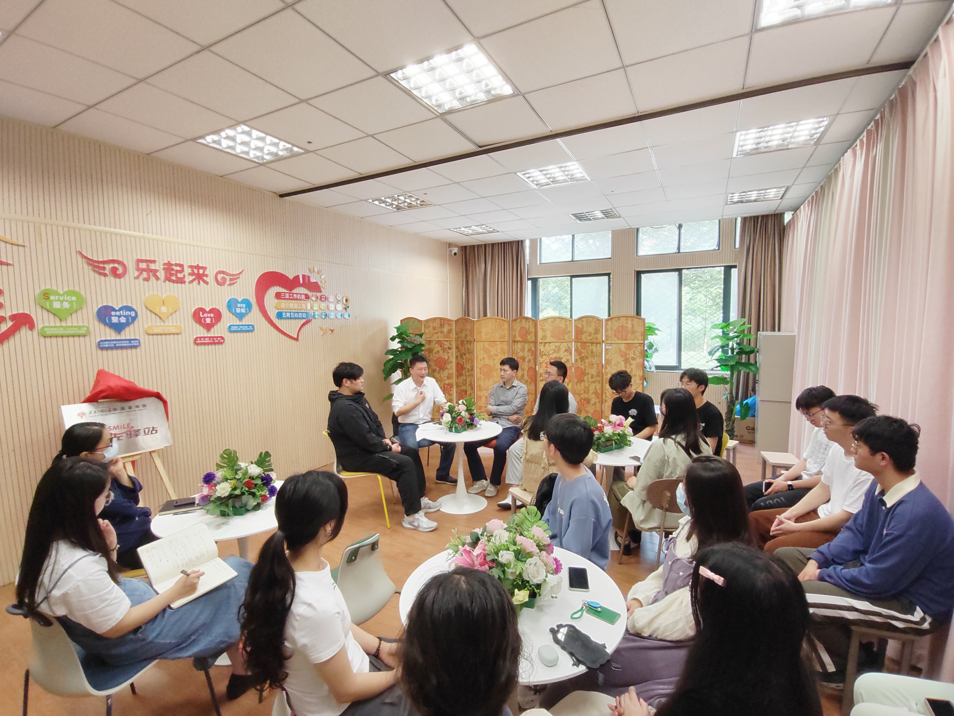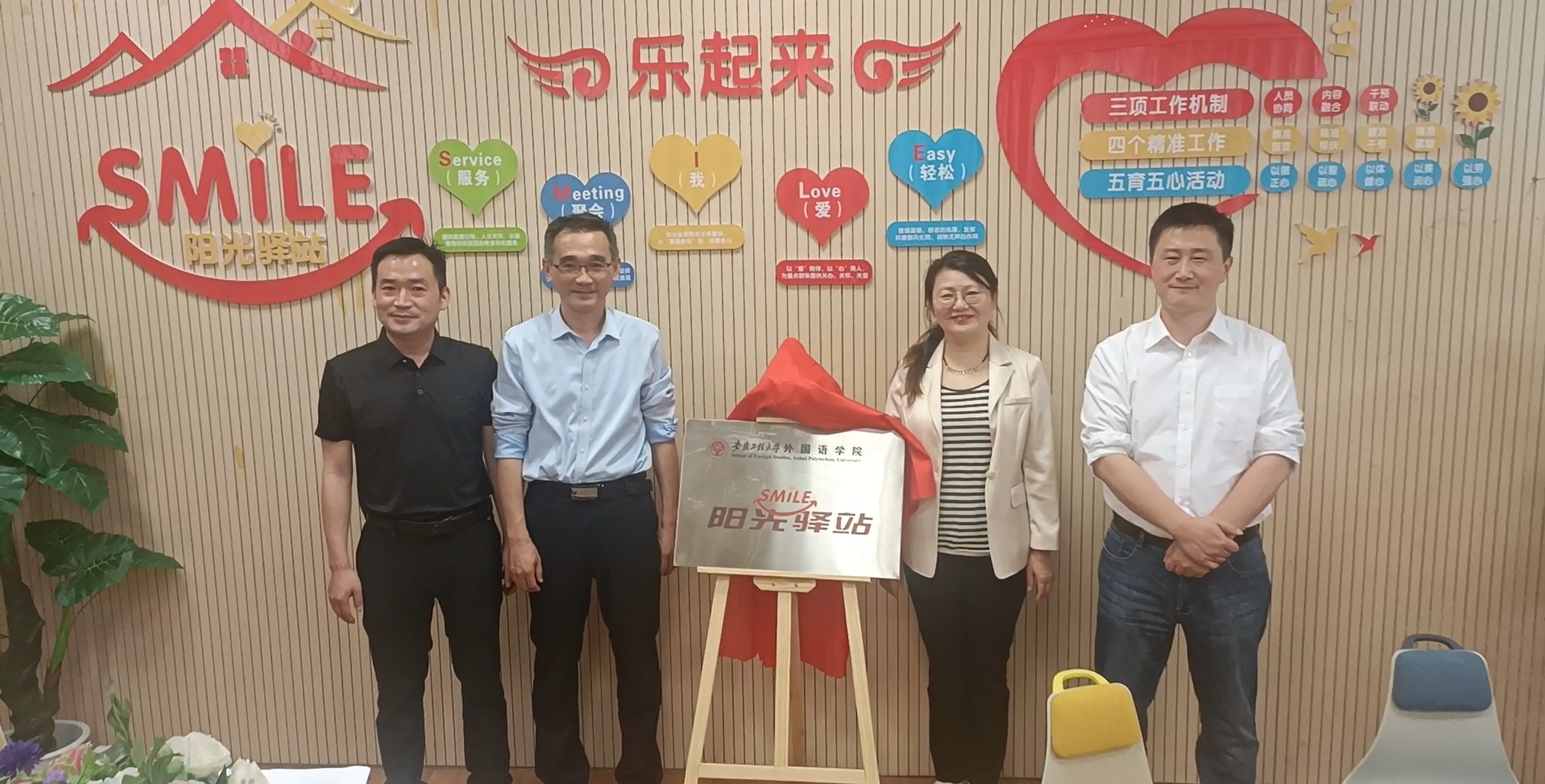 “SMILE”阳光驿站是学校外国语学院联合校学生处、校心理健康中心设立的学校首个学院心理健康活动驿站,旨在围绕学校“乐”起来的育人实践,探索学院心理健康工作的新途径,打造“乐”起来品牌项目,提升基层学院心理育人质效。“SMILE阳光驿站”坚持以学生为中心,围绕S“Service(服务)”、M“Meeting(聚会)”、I“ I(我)”、L“Love(爱)”、E“Easy(轻松)”主题,通过“人员协同机制”“内容融合机制”“干预联动机制”三项机制,做好对全体学生开展精准筛查、对重点群体实施精准帮扶、对危机群体开展精准干预、对心理健康工作人员精准赋能这四项精准基础工作,扎实开展以德正心、以智疏心、以体健心、以美润心、以劳强心“五育五心”实践活动,打造心灵护航“加油站”,致力学生“乐起来”。