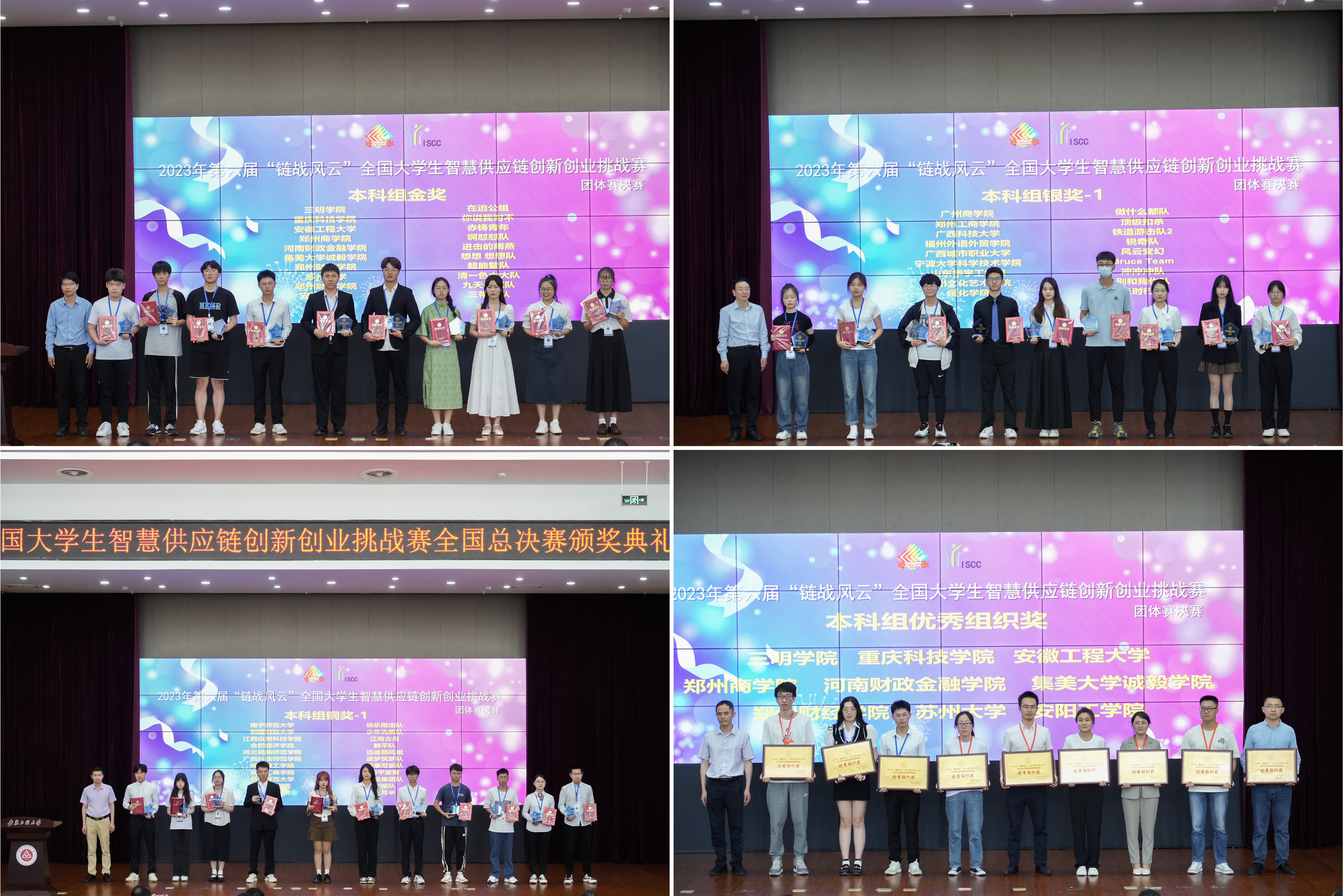经过为期两天的激烈角逐,大赛决出本科组金奖10队、银奖17队、铜奖21队;制造商创新创业金奖1队、分销商创新创业金奖1队、零售商创新创业金奖1队、物流商创新创业金奖1队、供应链运营实践金奖1队、供应链协同运营金奖4队;高职组金奖9队、银奖15队、铜奖19队、制造商创新创业金奖1队、分销商创新创业金奖1队、零售商创新创业金奖1队、物流商创新创业金奖1队、供应链运营实践金奖1队、供应链协同运营金奖4队。大赛组委会为获奖队伍进行了颁奖。我校经济与管理学院程永宏和董丰老师指导朱永俊、付恩民、许晴和吴伟杰4位同学组成的“赤铸青年队”获得了本科组团体赛金奖,本次成绩刷新了我校参与全国大学生智慧供应链创新创业挑战赛以来的最好成绩。学校被中国商业联合会授予“优秀组织奖”。
