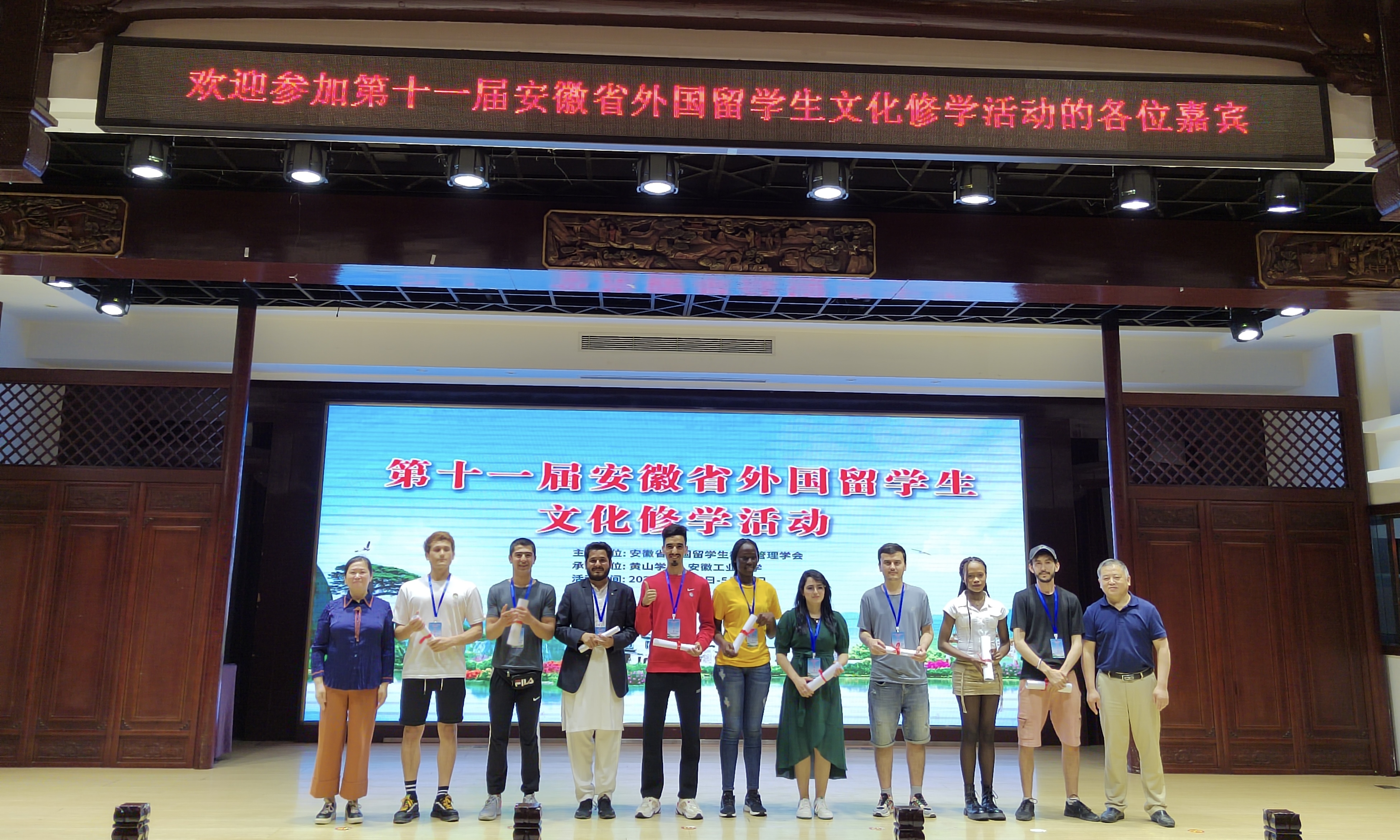 本网讯 5月25日至28日,安徽省教育厅、安徽省外国留学生教育管理学会主办了主题为“徽山·徽水·徽文化”的第十一届安徽省外国留学生文化修学活动,来自省内18所高校174名留学生代表参加了文化修学活动。我校组织来自摩洛哥、加纳、乍得3个国家的9名留学生参加本次活动。