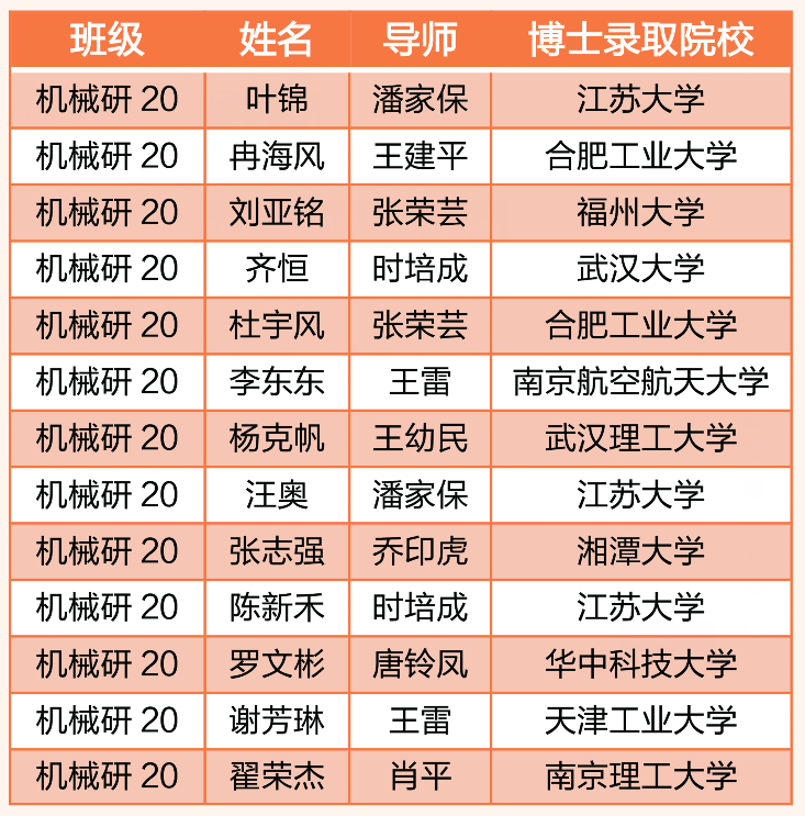 本网讯 连日来,全国各博士研究生招生单位陆续发布2023年博士入学录取人员名单,截至2023年5月30日,机械工程学院共计13名2023届研究生成功考取博士,占学院毕业研究生总人数的13.27%。被录取的高校包括华中科技大学、武汉大学、南京航空航天大学等“双一流”高校和机械工程领域强势学科高校。