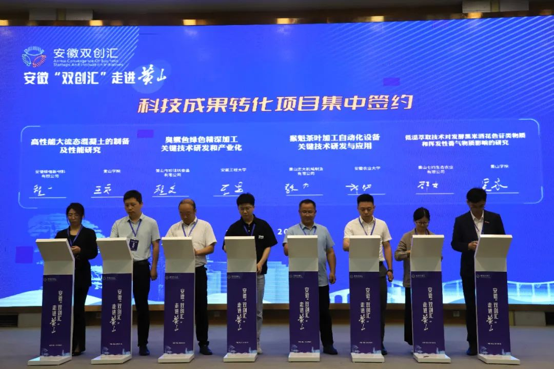 活动现场,化学与环境工程学院副院长徐大勇代表学校开展“降碳减污系列成果”科技成果路演,生物与食品工程学院王军代表学校与黄山市珍味坊食品有限公司签订“臭鳜鱼绿色深加工关键技术研发与产业化”成果转化合约。