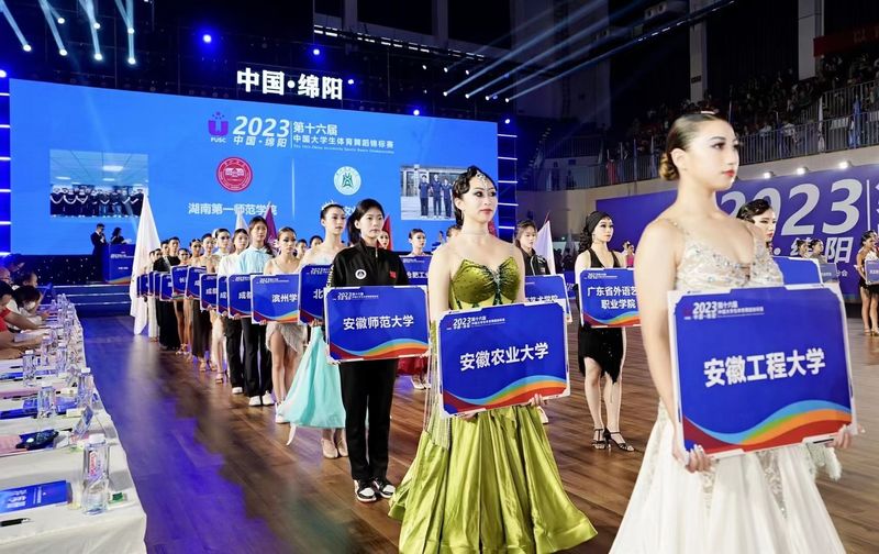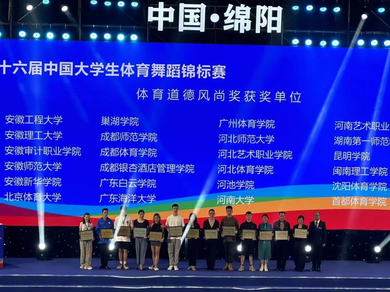 本网讯 5月30日至6月3日,第十六届中国大学生体育舞蹈锦标赛在四川绵阳举行。我校荣获1个个人第一、1个团体第一,多个项目第二和第三的好成绩,我校代表队捧得体育道德风尚奖,陶惠慧老师获得优秀教练员奖。