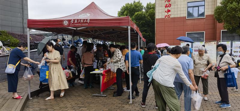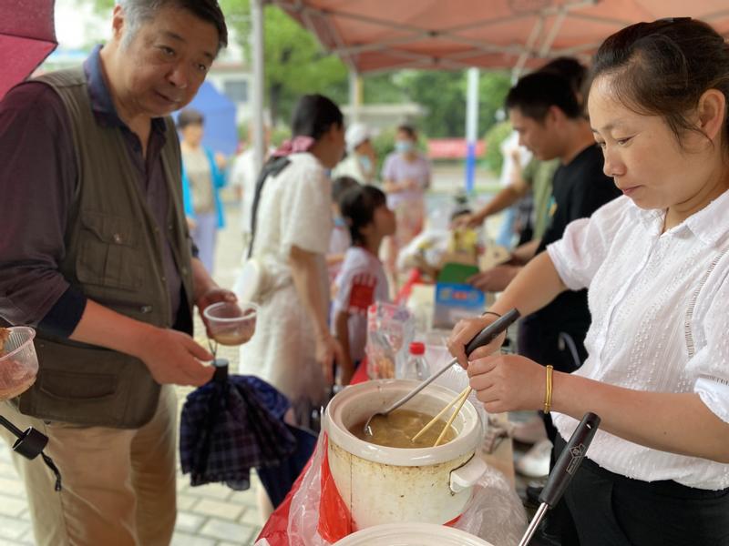 这是学校首次与驻村点南陵县龙山街道涧滩村联合开展“农村集市进校园”活动,大雨也阻挡不住开市的火爆,仅仅20分钟,猪肉、土鸡、仔鸡、老鸭、鸡蛋就销售一空,活动现场,农民兄弟还特地将起早炖好的鸡汤和鸭汤带来供大家品尝。火爆的销售让中国好人龙山村第一书记胡太平笑得合不拢嘴,他说这才是乡村振兴的好平台。