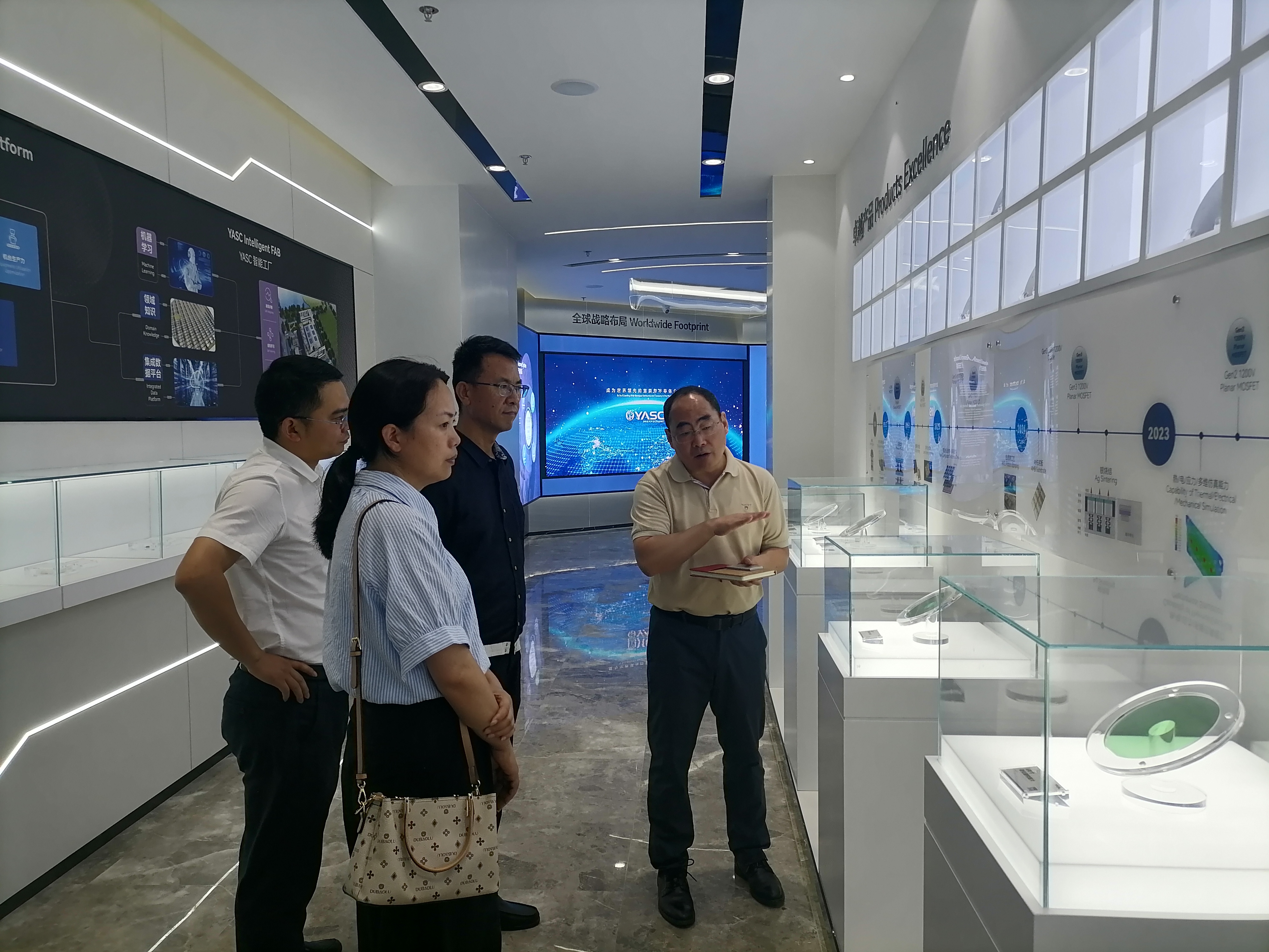 刘红超对高彦峰一行的到访表示热烈欢迎,并陪同参观了公司展厅,简述了公司的发展历程,重点从人才引进、新产品研发、工艺开发、生产体量及销售市场等方面介绍了公司的发展情况。