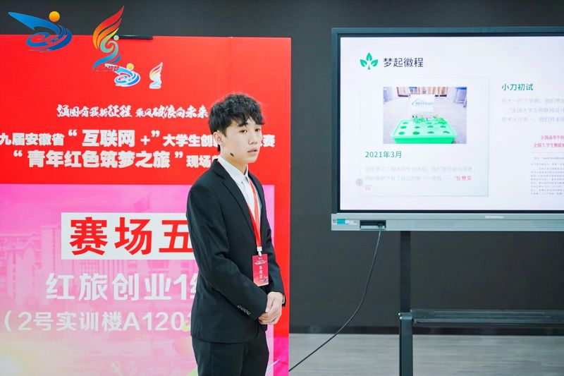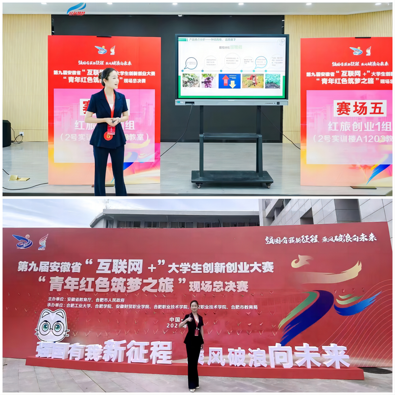 经省赛专家网评,我校红旅创业组2项作品进入现场总决赛。作品《桃之夭夭,葡葡丰成——5G智慧果园的领跑者》以其立意新颖、汇报精彩而脱颖而出,荣获安徽省红旅创业组金奖,作品《“链”来振兴——用前沿技术赋能农产品产供销一体化》荣获安徽省红旅创业组银奖。