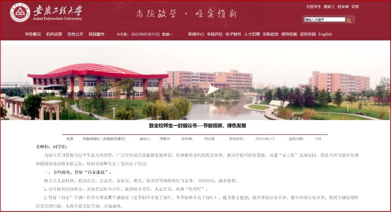 工作前置,强化宣传教育引导。为确保宣传教育达实效,后勤保障处提前启动节能宣传工作,6月在学校网站向全校师生发布《致全校师生一封倡议书---节能低碳,绿色发展》,要求各学院部门深入学习贯彻习近平生态文明思想,广泛宣传绿色低碳新发展理念,倡导勤俭节约优良传统。号召大家树立主人翁精神,管好“自家能耗”,把用电用能当成家事;齐抓共管,看好“自家一亩三分地”,学校将适时开展专项巡查,坚决制止不文明用能现象并予以曝光;工作例会上进行专题布置,将节能要求传达给每位教职员工和留校学生,动员全校师生做好节能减排工作。