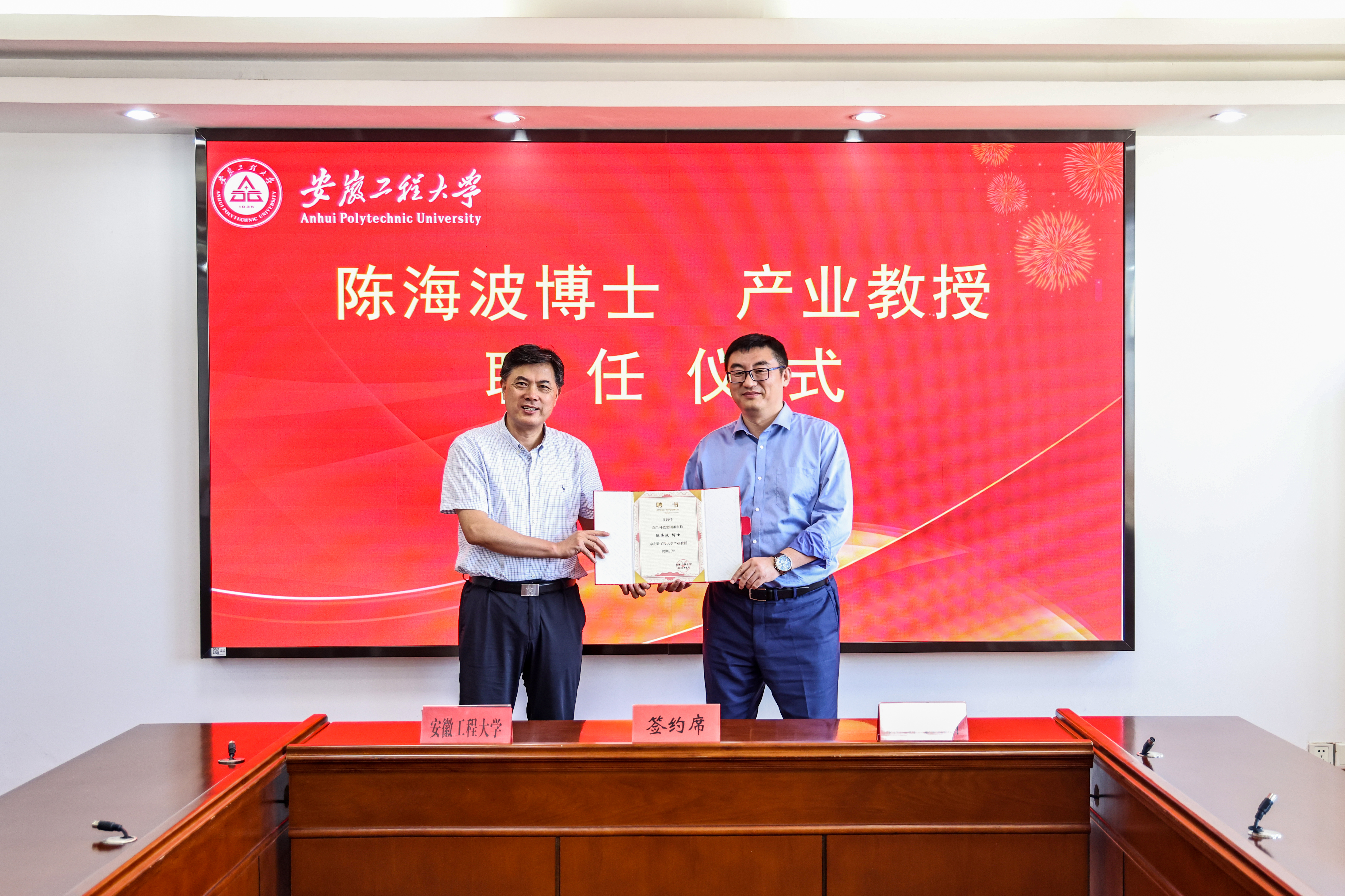 张志宏为陈海波颁发产业教授聘书,苏国红代表学校与企方代表签订校企战略合作协议。