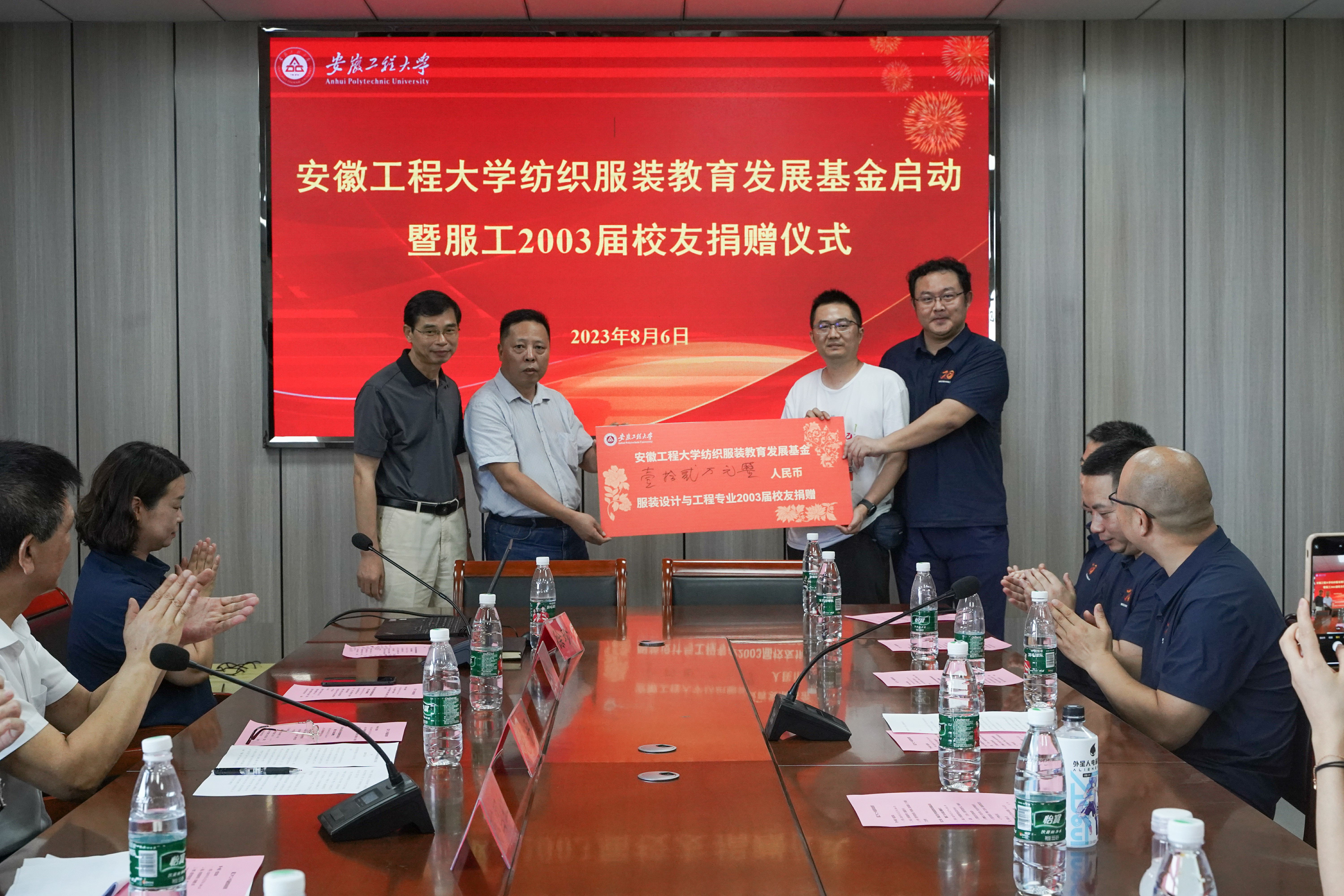服装设计与工程2003届校友纷纷发言,畅谈同学情、师生情、母校情,并汇报了个人发展情况,为学校人才培养和科技创新建言献策。校友李辉、江宝林代表服装设计与工程2003届全体同学发起“安徽工程大学纺织服装教育发展基金”并捐赠了首笔资金。