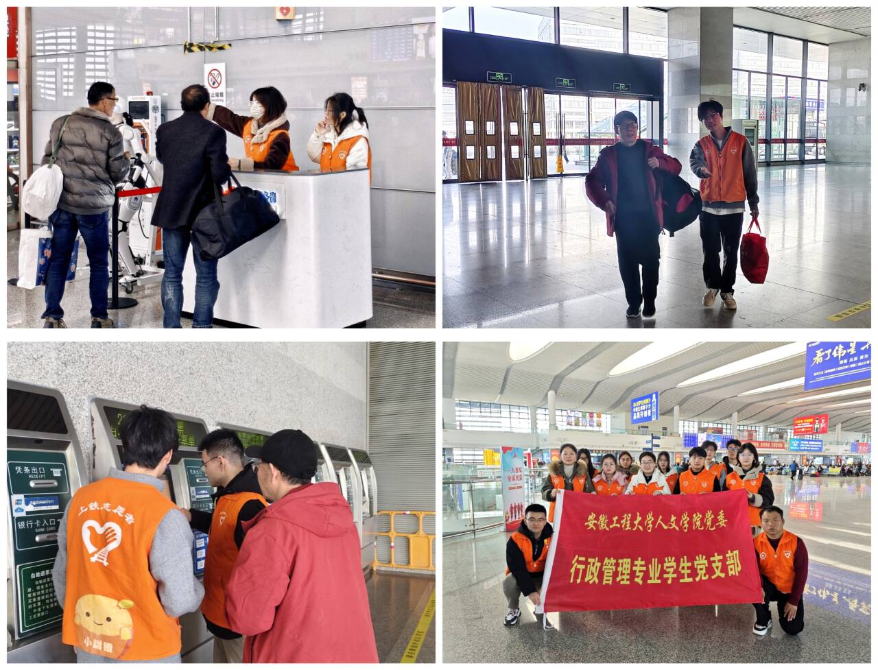 车站志愿显担当。在芜湖火车站,“暖途”青年志愿者服务社联合行政管理专业学生党支部共同开展志愿服务活动。活动中,党员志愿者们主动靠前、热情服务,为往来旅客提供行李搬运、路线咨询、信息解答等便民帮助,用耐心与细心传递温暖与善意。
