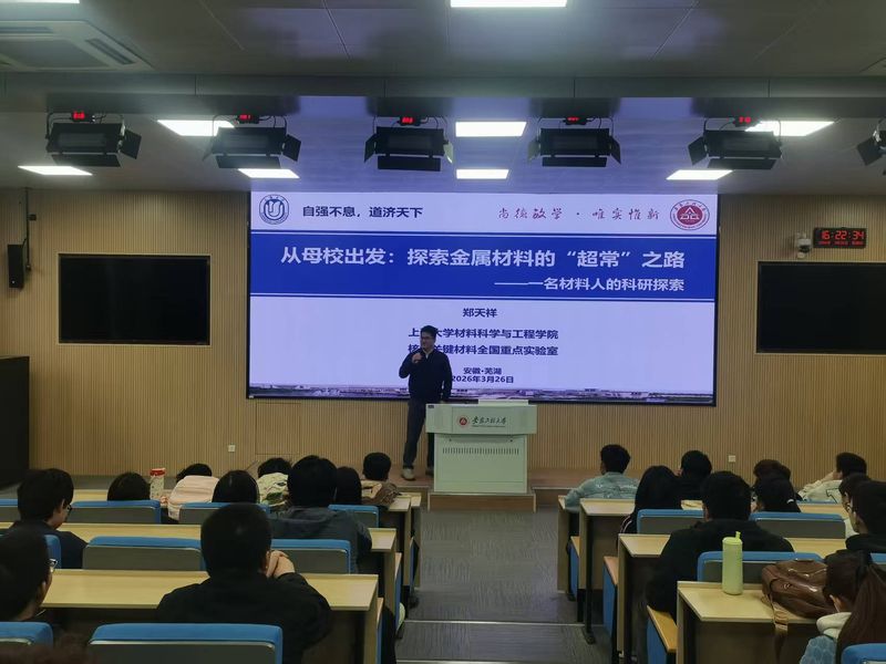 郑天祥以“从母校出发”为切入点,深情回顾了自己在安徽工程大学的求学时光,感恩母校的悉心培育与恩师的谆谆教诲。他围绕报告主题,结合自身科研经历,用通俗易懂的语言解读了金属材料领域的前沿动态与“超常”探索之路。郑天祥鼓励同学们要珍惜大学时光,牢记材料人的使命与担当,立足专业,脚踏实地,为我国高性能金属材料产业的发展贡献青春力量。
