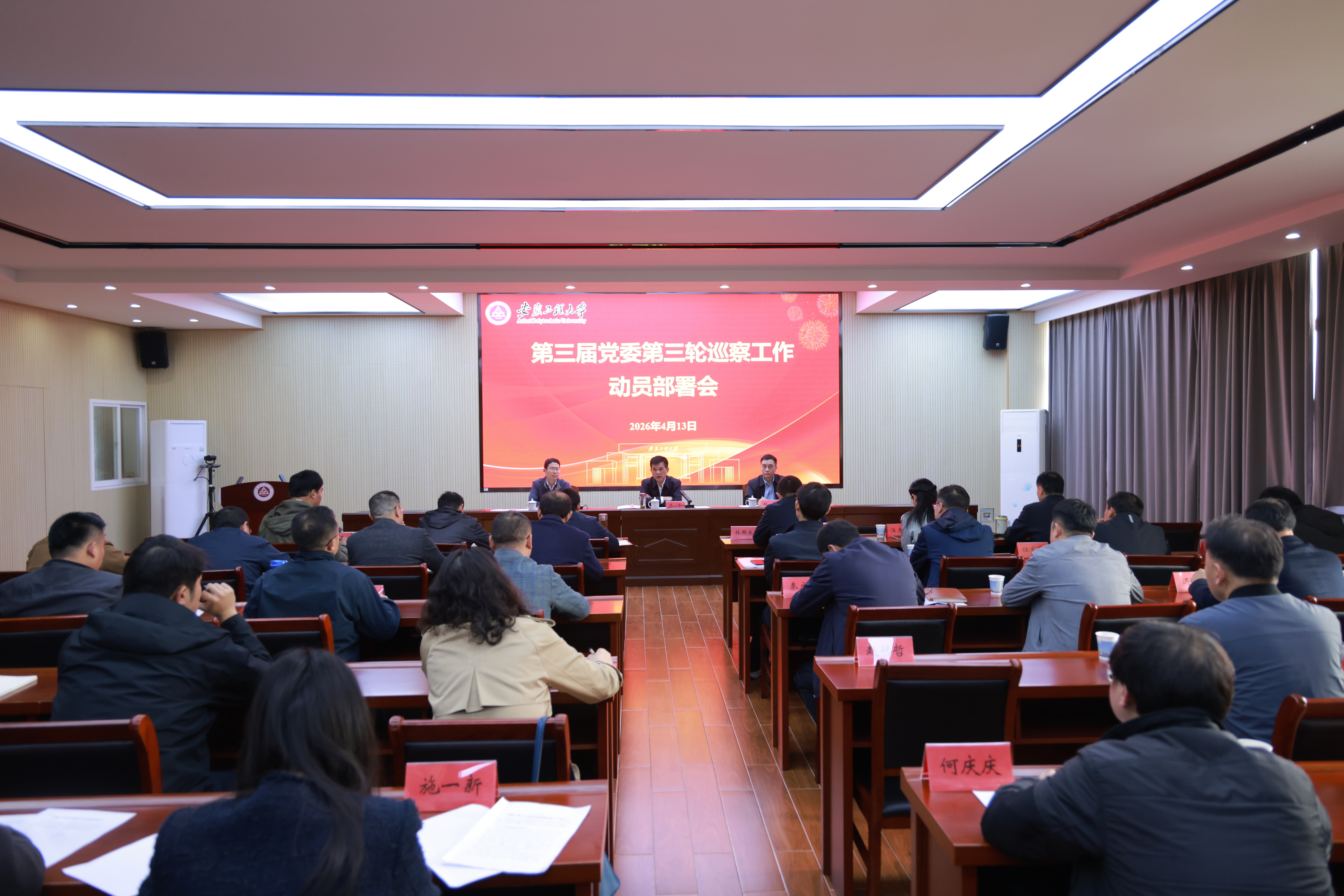 本网讯 4月13日,学校党委在行政楼A座1314会议室召开第三届党委第三轮巡察工作动员部署会。校党委书记、巡察工作领导小组组长卢平,校党委副书记、巡察工作领导小组副组长郑健,校党委常委、纪委书记、监察专员、巡察工作领导小组副组长程双四出席会议。校党委巡察工作领导小组成员、巡察组全体成员、被巡察单位党政领导班子成员、巡察办人员参加会议。