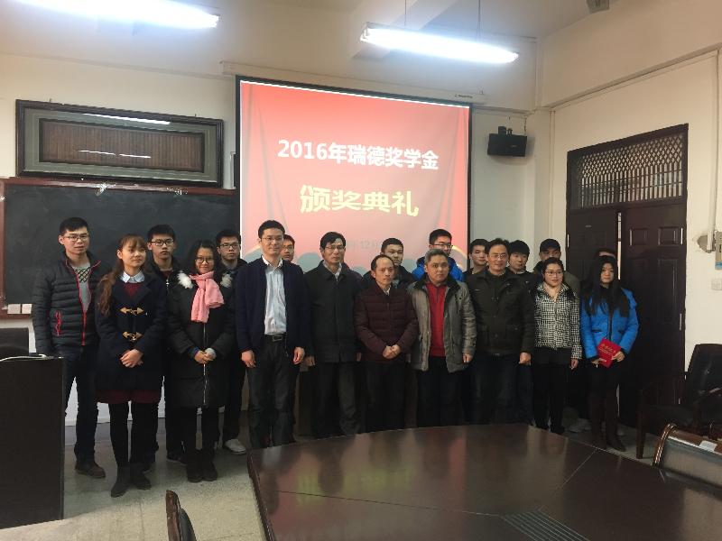 12月27日下午,2016年“瑞德奖学金”颁奖典礼在电气工程学院会议室举行。广东瑞德智能科技股份有限公司副总裁、研发中心主任、创新中心总经理方桦,瑞德浙江地区总经理姚继能,电气工程学院党委书记杨会成,校创新学院副院长、院电子协会指导老师王冠凌以及获奖学生出席了颁奖典礼。典礼由院党委副书记郭全根主持。