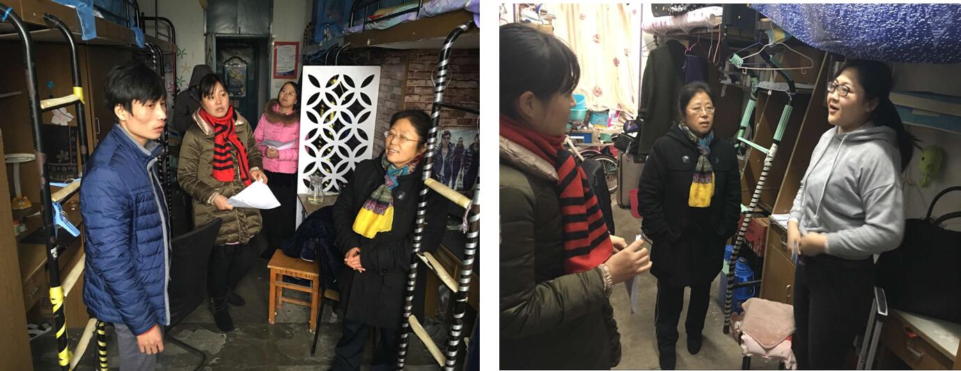 为确保学生安全平稳离校, 1月10号上午,艺术学院党委副书记孟向红、团委书记迟传德和全体辅导员,深入男生宿舍16#和女生宿舍1#、6#、8#进行走访,察看学生寒假离校宿舍安全情况。