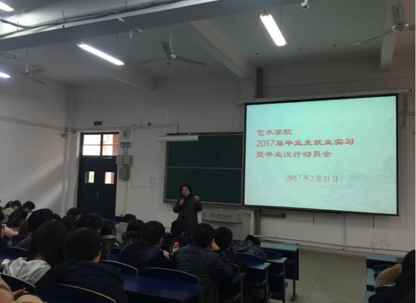 2月21日下午,艺术学院在6教214多媒体教室召开2017届毕业生就业实习暨毕业设计动员大会。学院党委书记刘金斌、院长黄凯出席大会,会议由学院党委副书记孟向红主持。2017届毕业生参加了会议。