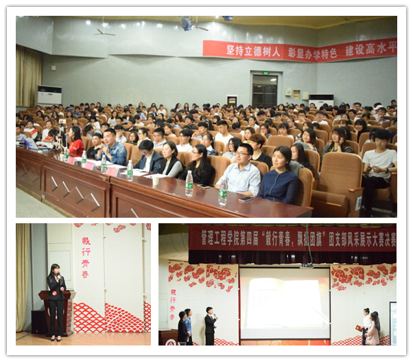 为落实基层团组织建设,增强团员意识,加强各团支部组织凝聚力,4月16日晚,管理工程学院在学术报告厅举办了“毅行青春飘扬团旗”第四届团支部风采大赛。校党委组织部秘书梁雪松、生化学院团委书记胡云、校团委赵争老师应邀担任评委,学院团委书记朱文明、辅导员赵恒梅、张孝琪老师到场观看了比赛。