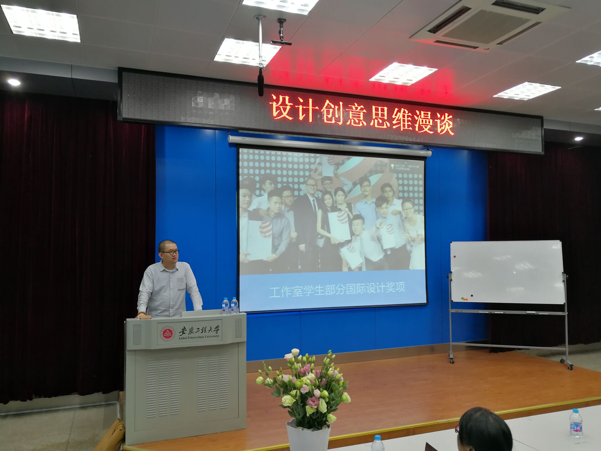 5月19日上午,应艺术学院邀请,广州美术学院生活工作室教授张剑在5教117教室举办《设计创意思维漫谈》讲座。艺术学院工业设计系系主任王小元、部分教师和学生,以及安徽师范大学产品设计专业的部分师生前来听讲座。讲座由艺术学院副院长张学东主持。