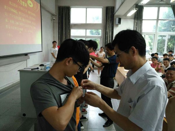 会上,杨会成带领全体学生党员进行新党员入党宣誓暨老党员重温入党誓词仪式。面对鲜红的党旗,大家高举右手,发出铮铮誓言。随后,杨会成和郭全根为新发展入党的学生党员代表佩戴党员徽章。杨会成指出,通过新党员入党宣誓暨老党员重温入党誓词活动,激励新老党员严格要求自己,牢记入党誓词,不忘初心,以党章规范自己的言行,在今后的学习工作中,一定要向优秀党员学习,学习他们勇于奉献和担当的精神。同时,要通过“两学一做”学习教育,不断提高自身思想觉悟,并以优秀党员为标尺,积极主动在“做”上下功夫,努力践行党的宗旨。