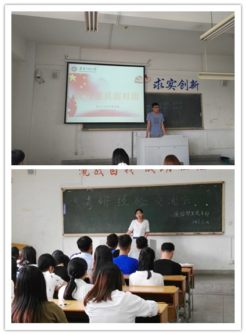 交流会分为分享和提问两个环节。分享阶段,各支部推荐的优秀考研学生就为什么要考研以及如何做好考研复习等问题做了详细讲解。其中,电气工程及其自动化专业学生党支部胡毅同学今年成功被湖南大学录取,他和同学们分享了自己从不考研到决定考研到中途想放弃再到坚持到底的考研历程,他认为考研的成功等于正确的方法加上不懈的努力及恰当的复习材料。通信工程专业学生党支部马芹芹同学就成功考取东南大学的学习经验与学弟学妹们做了分享,她鼓励学弟学妹们应该具有锲而不舍的精神,不能因为考研之路的艰难而放弃,要发扬电气学子吃苦耐劳的精神,为自己的理想砥砺奋进。