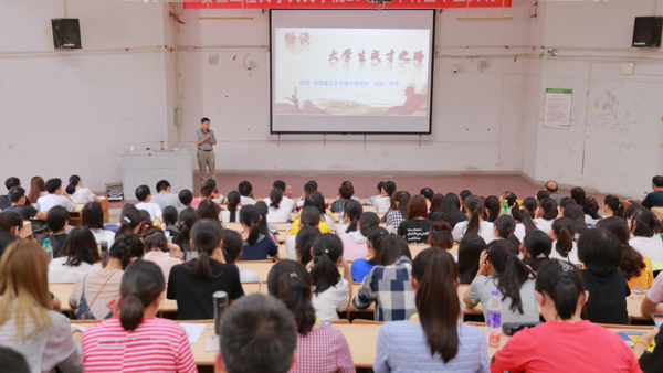 报告中,陆健结合数理学院的特点从培养四种能力、学好数学的重要性、做高素质公民谈大学生成长之路。他说,走好大学的第一步是尽快实现有中学到大学的角色转变,尽快的适应大学生活。要培养较强的学习能力,养成良好的学习、生活习惯,以取得学士学位和毕业证为底线;要有较强的生活能力,学会利用业余时间,参加社团等学生团体,结交朋友,增长见识,增强生活能力、提升生活品味、提高生活档次;要加强体育锻炼,提高身体素质,做到“情商”与“动商”的双提高;要有独立工作的创新能力,面对互联网+、云计算这样的信息时代,打牢基础,培养创新意识,提高创新能力。他以励志故事、院士的成功体会指出数学不再是一门简单的课程,它渗透在人们生活的方方面面,并与高新科技有着密不可分的联系,小至天气预报中的大数据统计,大至宇宙天体的命题研究都离不开数学基础,引导大家思考学好数学的重要性,感受数学美。最后,他特别强调,在物质生活相对丰富的时代,我们大学生更要争做文明的榜样,既有根植于内心的修养,又有无需提醒的自觉;既有以约束为前提的自由,又有为别人着想的善良,努力成为一名“有学问、有品质、有品格、有风度、有气质、有气场”的“六有”青年。在交流环节中,陆健以南京理工大学为例,运用生动的案例和具体的数据,就学生关心的课前预习方法、考研升造情况等问题给与了认真详细的解答。