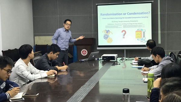 10月12日下午,应校科技处、研究生部和计算机与信息学院邀请,美国天普大学(Temple University)计算机与信息科学学院副教授张凯在计算机与信息学院会议室作了题为“Randomization or Condensation? Linear Cost Matrix Sketching Via Cascaded Compression Sampling”的学术报告,计算机与信息学院教师、研究生和部分计算机科学与技术专业学生聆听了报告。报告由计算机与信息学院教授刘涛主持。