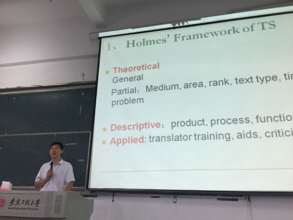 安徽师范大学外国语学院院长张德让在课程中以“中西翻译研究四题”为内容介绍了翻译学的前沿发展。从Holmes的翻译研究框架、Jakobson的翻译三分法以及当代西方翻译理论,谈到国内翻译研究发展的新走向和新趋势,站在学科及方向前沿给同学们上了精彩一课。