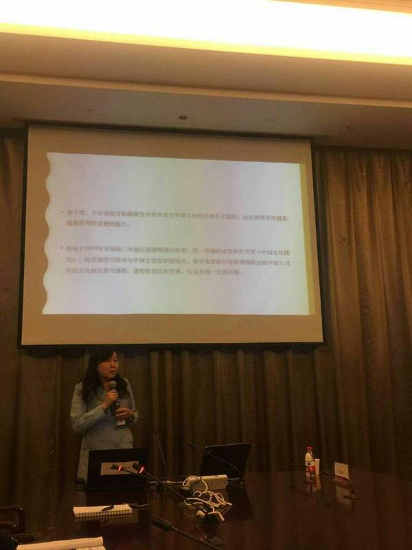 在专题研讨中,张凤梅做了“跨文化视域下英语学习者本土文化表达能力培养探索”的发言。从我校历时三年的英语泛读课程改革经验入手,探讨了英语学习者“中国文化失语症”的解决方案,分析了现行教材中存在的内容割裂、缺乏有机性与统一性问题,指出教材中存在的一些常识性错误,提出以思想史、观念史视角来重构教材的主张。发言得到了各位学者的积极响应。