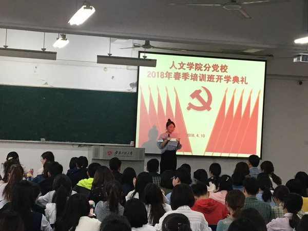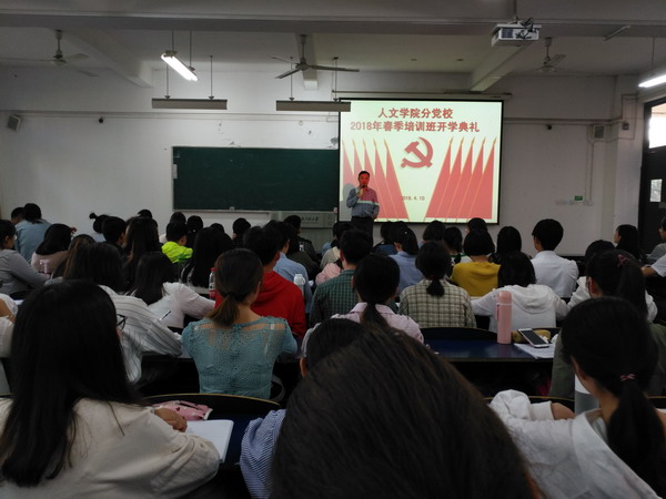 4月10日下午,人文学院分党校2018年春季培训班开学典礼在6教113隆重举行。院党委书记邓英扣、副书记金艾裙、第八期学生党员培训班班主任谢红翠、第一期发展对象培训班班主任李婕、第二十一期入党积极分子培训班班主任梅琼出席了本次典礼。典礼由金艾裙主持,全体学员参加了开学典礼。