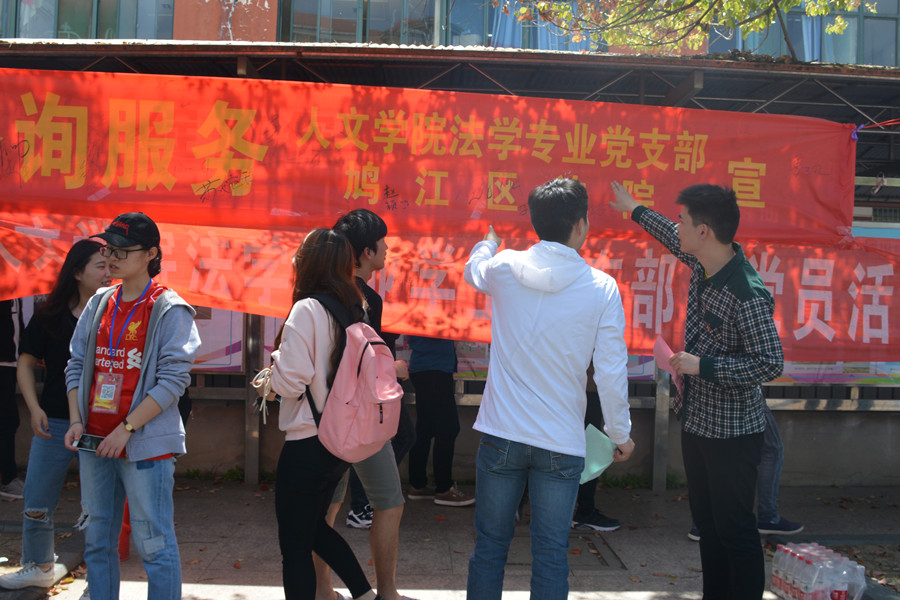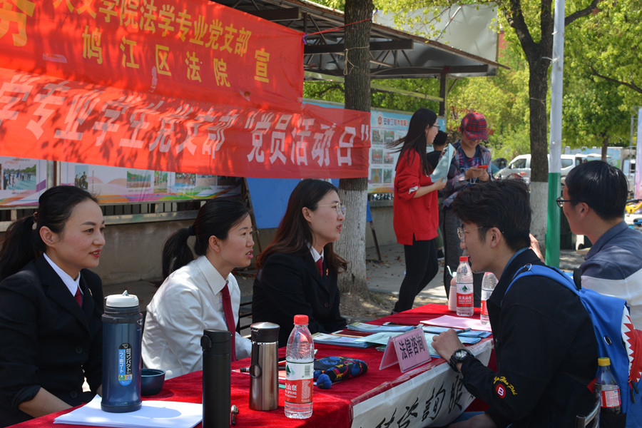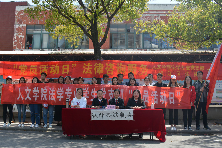 为弘扬十九大精神,践行全心全意为人民服务的宗旨,发挥法学专业学生党支部专业的特色,4月10日上午,人文学院法学专业党支部与芜湖市鸠江区法院第二党支部在校第三食堂前共同开展以“法律咨询服务”为主题的“党员活动日”活动,向学生们提供“一对一”法律咨询服务。