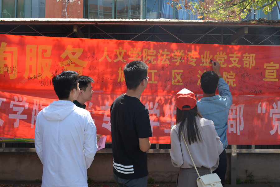 活动现场,学生咨询热情高,内容涉及面广,包括网络维权问题、婚前财产公证问题、借贷款、房屋租赁合同等。对于学生的问题,学生党员和四名法官耐心为其解惑,获得良好成效,最后咨询的同学们在旗帜上签字留念。在当天的活动中,现场发放宣传资料几百份余份,接受法律咨询等100余人,既宣传了法律,也服务了广大的学生群体。