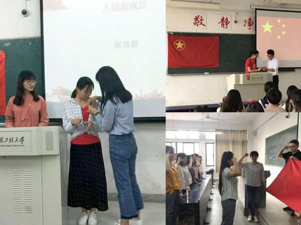 英语172、英语161等团支部分别有5名同学经过了支部和院团委的严格审查,光荣地加入了共青团。各个支部分别开展了新团员入团仪式,院团委委员和各支部新老团员一起参加了活动。参加活动的院团委委员为新团员颁发了团员证,佩戴上团徽,表达了对新团员的美好祝愿和殷切期望。新老团员以宏亮的声音,面对鲜艳的团旗,一起庄严的宣誓:“我志愿加入中国共产主义青年团,坚决拥护中国共产党的领导……”