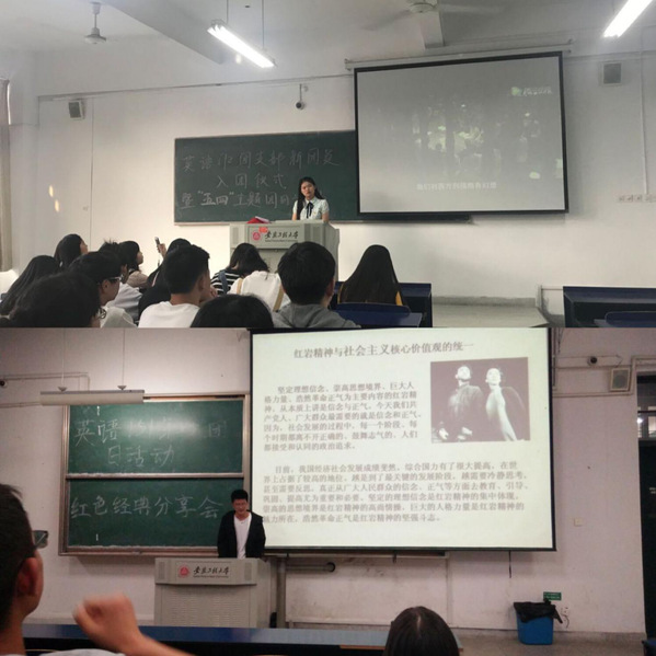 英语162团支部则邀请了学院部分优秀学生代表和大家分享自己的心路历程。省“青年志愿者优秀个人”、院团委副书记王玉燕谈到“作为一名团员需要认识到仅仅在组织上入团是远远不够的,还要用实际行动切实做到在思想上、行动上符合团员标准”;校“十佳大学生”、赤铸青年刘宏阳通过分享自己的军旅生涯和返校后的经历,向大家诠释着在守卫海疆、担任教官中的成长。