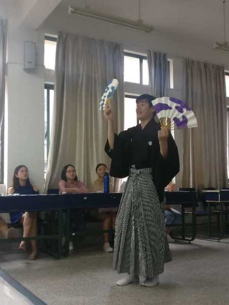 首先,菅田进行了生动有趣的自我介绍,通过三国演义、富士山、樱桃小丸子等大家熟知的事物,拉近了与同学们的距离。随后,菅田先生通过与京剧的对比,深入浅出地介绍了能乐的历史、题材、构成要素及流派等。通过菅田的演示,同学们了解到“扇子”这一常见工具在能乐表演中发挥着重要作用,并由此认识到能乐是一种充满想象力的抽象艺术形式,需要大家用心去感受。菅田还向大家展示了能乐的服装,介绍了关于“家纹”等知识。最后,菅田为大家演示了《八岛》中的片段,并播放了经典剧目《道成寺》中的选段视频,使大家进一步领略到“能乐”这一日本传统艺术之妙,对“幽玄”这一日语词汇也有了亲身感受。