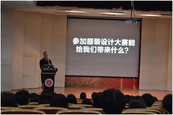 冯三三先从自己的亲身经历出发,分享他十年的梦想之路。从当初的默默无闻的普通学生到如今中国最年轻的中国十佳设计师,他用自己的设计师之路生动地向大家诠释了“梦想需要坚持,付出终有回报”的人生信条。随后,冯三三详细介绍自己最近两次的精彩发布会,以及“中国时装设计新人奖”和一些大赛的优秀作品,包括我校学子近年来的获奖作品,通过这些参赛学生的作品,鼓励在座学生要勇敢追梦,向优秀的人学习,敢于去发掘自身潜力,就可以创造属于自己的奇迹。