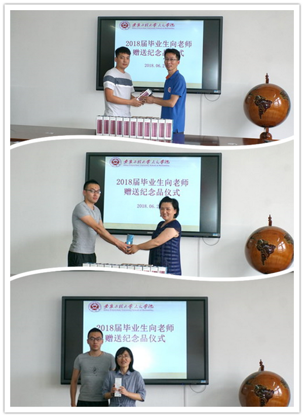 感恩母校,难忘师恩。6月27日下午,人文学院2018届毕业生给老师赠送纪念品仪式在九教举行。院党委书记邓英扣,院长刘军,党委副书记金艾裙,教师代表杜蓓蕾、蒋艳、汪茂泰以及毕业生代表周明明、王沛奇参加此次仪式。