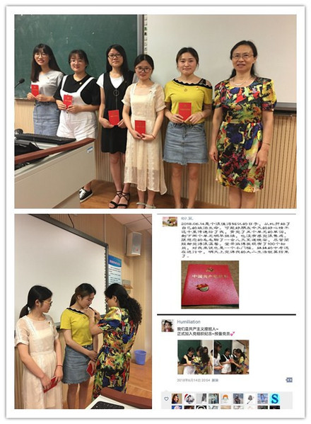 学院党委副书记谈丽华为5位新党员颁发《中国共产党章程》、佩戴党员徽章。随后,5位新党员和支部全体党员在支委胡茜茜的带领下,面对党旗,郑重举起右手,庄严宣誓,表达对党的忠诚、为共产主义事业奋斗终身的决心。支部书记余本祺对新党员表示祝贺,希望大家要心怀理想,不忘初心,牢记誓言,勇于担当。部分党员在仪式之后还纷纷发表“感言”,晒在自己的朋友圈里,记录神圣的一刻。