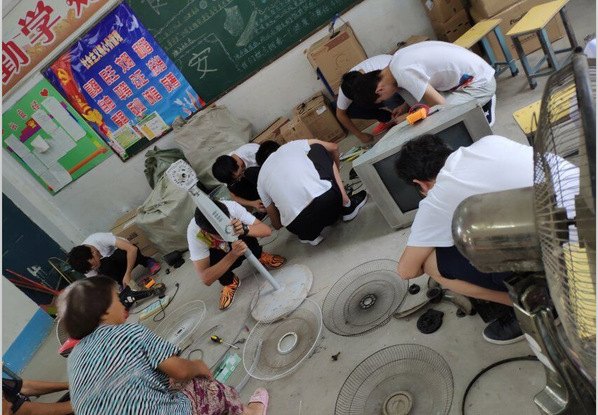 在鸭湖村小学教室里挤满了前来维修小家电的村民,“科技扶贫小分队”开展家电维修及置换服务项目的同学们义务为村民维修家用电器。同时,为了助力脱贫攻坚战略任务的实现,落实好学校关于定点帮扶工作任务安排,根据校团委和学院党委的统一部署安排,在以往家电维修的基础上,增加家电置换项目,这一行动得到了校友企业广东瑞德智能科技股份有限公司的大力支持,重点针对贫困村、贫困户,开展老旧家电免费以旧换新活动,把专业的维修技术与实实在在的关怀帮扶送到基层,深受当地群众的欢迎,村民们纷纷向现场的师生竖起了大拇指。