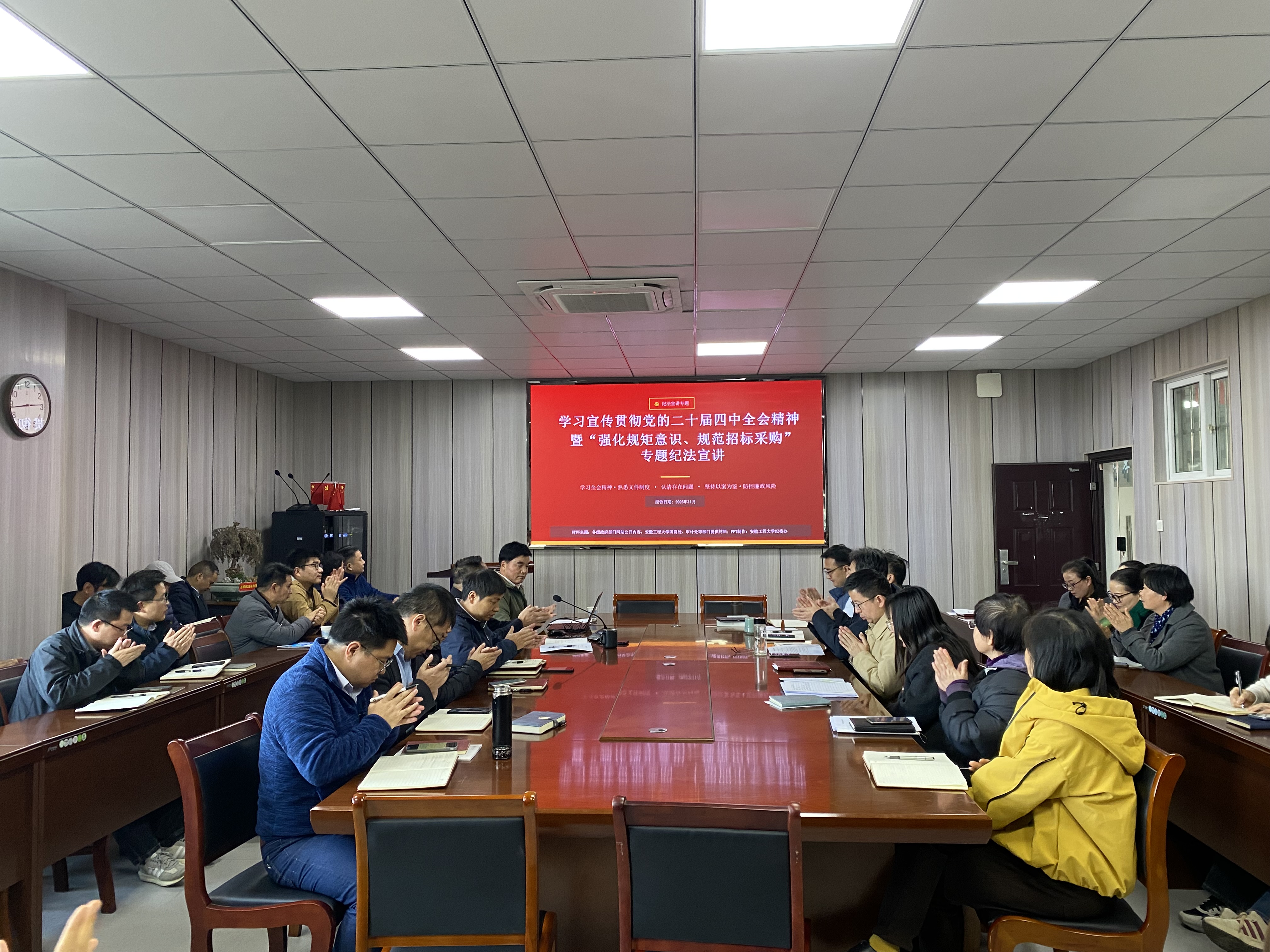 为深入学习宣传贯彻党的二十届四中全会精神,扎实推进全面从严治党,切实强化教职工招标采购领域纪法意识,有效防范廉政风险,11月26日,纺织服装学院在D座413会议室举办学习宣传贯彻党的二届四中全会精神暨“强化规矩意识、规范招标采购”专题纪法宣讲会,校党委巡察办正处级组织员易华作主题宣讲,学院全体教职工参加会议。会议由学院党委书记李长龙主持。