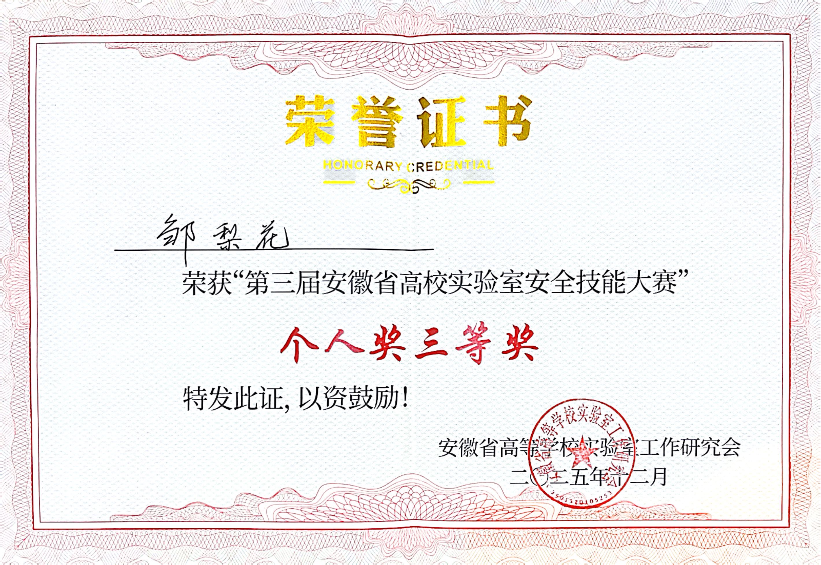 12月17-20日,安徽省高校实验室建设与管理研讨会暨第三届安徽省高校实验室安全技能大赛在黄山学院顺利举行。我院教师邹梨花代表学校参赛,凭借扎实的专业知识与出色的实践能力,在激烈竞争中脱颖而出,荣获个人赛三等奖,并助力学校代表队斩获团体赛三等奖。