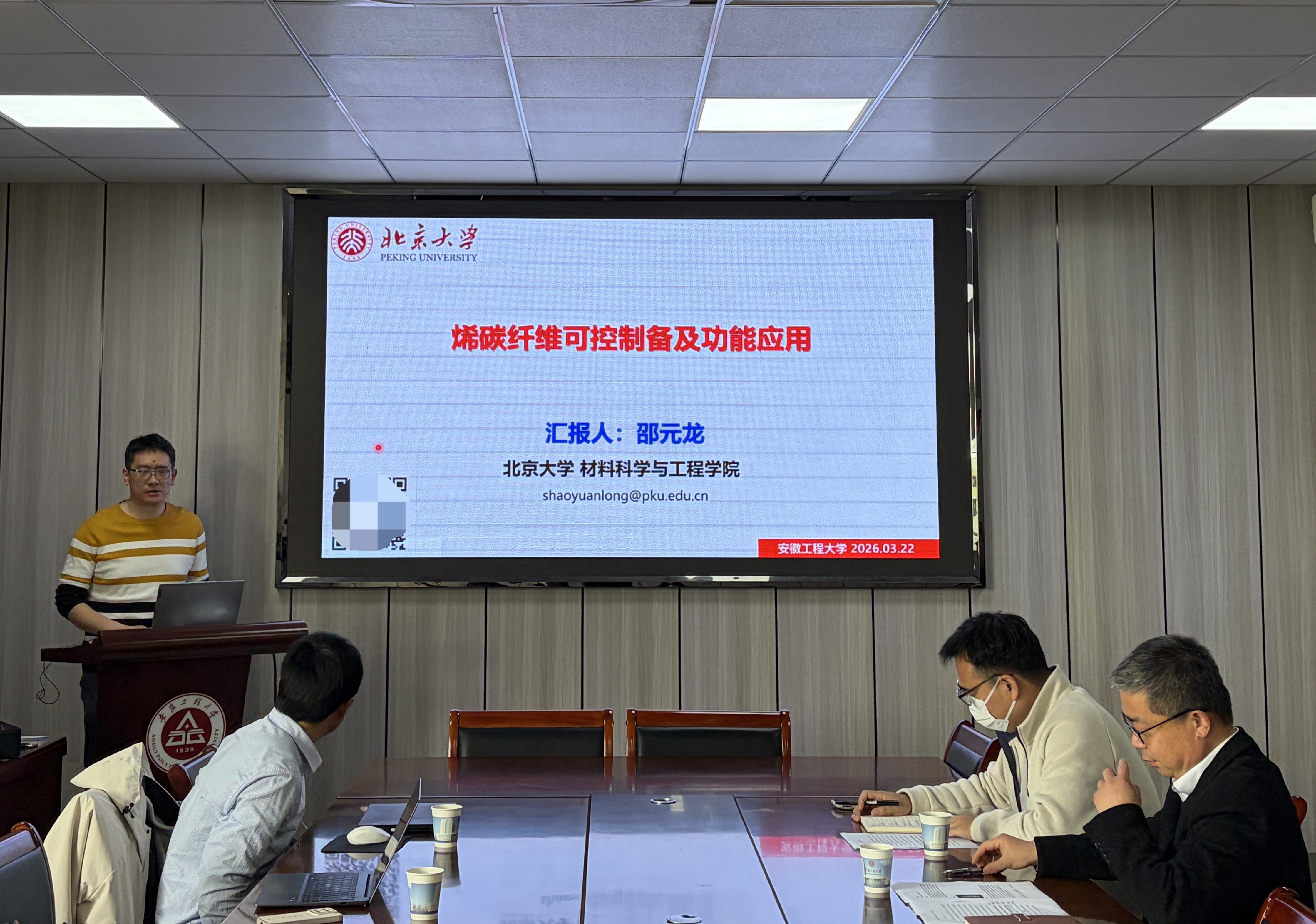 3月22日下午,纺织服装学院在D413举行学术报告会,特邀北京大学邵元龙特聘研究员与安徽工业大学吴操教授作专题报告。科技处处长王宗乾、纺织服装学院院长邢剑、学院教师代表及部分研究生参加了报告会,会议由王宗乾主持。