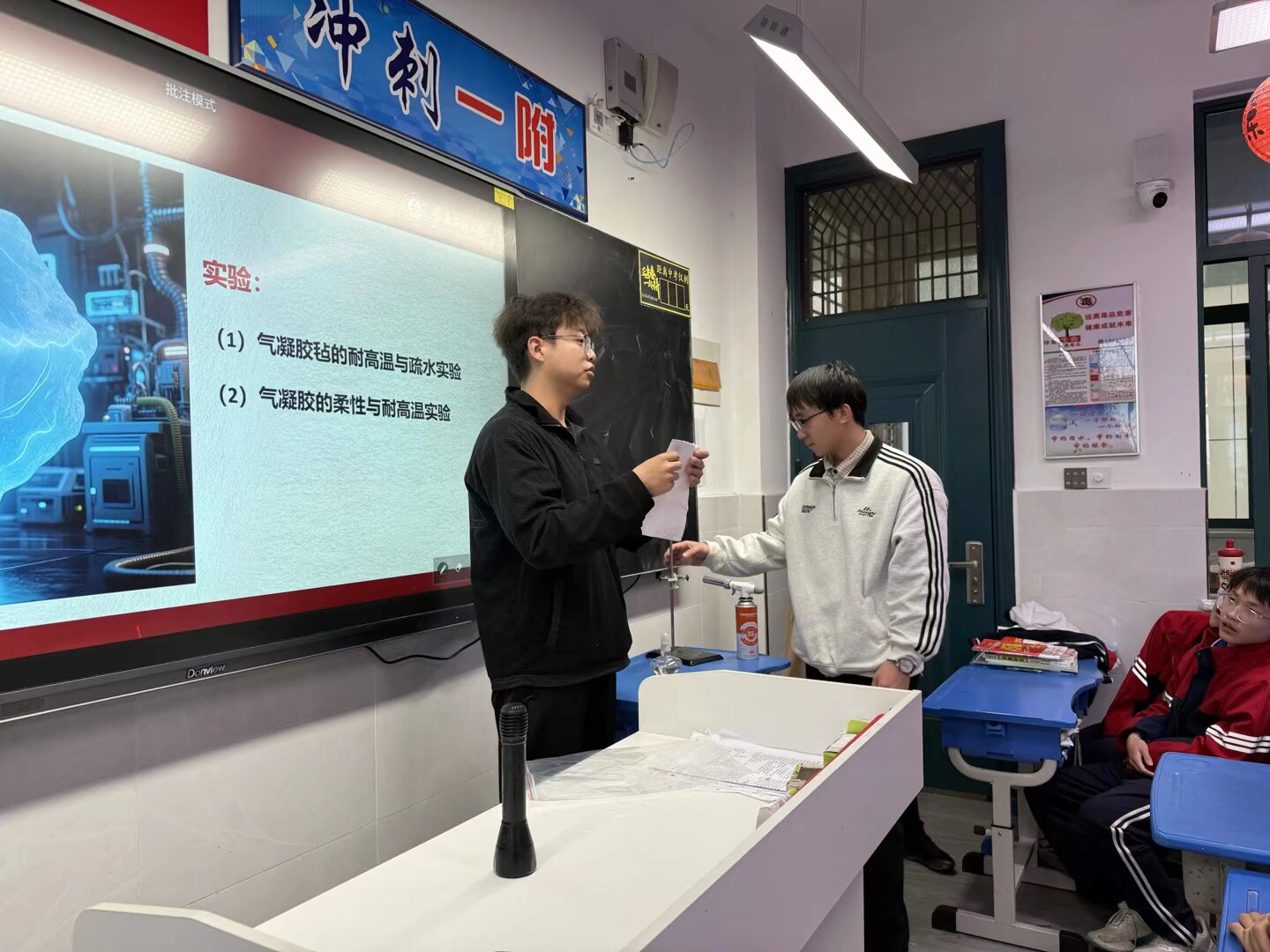 随后,材料与化工专业2024级研究生季严兴带着自己研究方向的最新成果,为同学们展示了纳米气凝胶趣味实验。这种以纳米“编织”技术打造的“固态空气”隔热层,具有极轻、极佳的隔热性能。通过现场实验,同学们直观感受到气凝胶在高温环境下的优异隔热效果,惊叹不已。季严兴还结合自己的科研方向,介绍了纳米气凝胶在航天防护、智能穿戴等领域的极限探索,让大家了解到小小的纤维材料竟能承载如此尖端的科技使命。