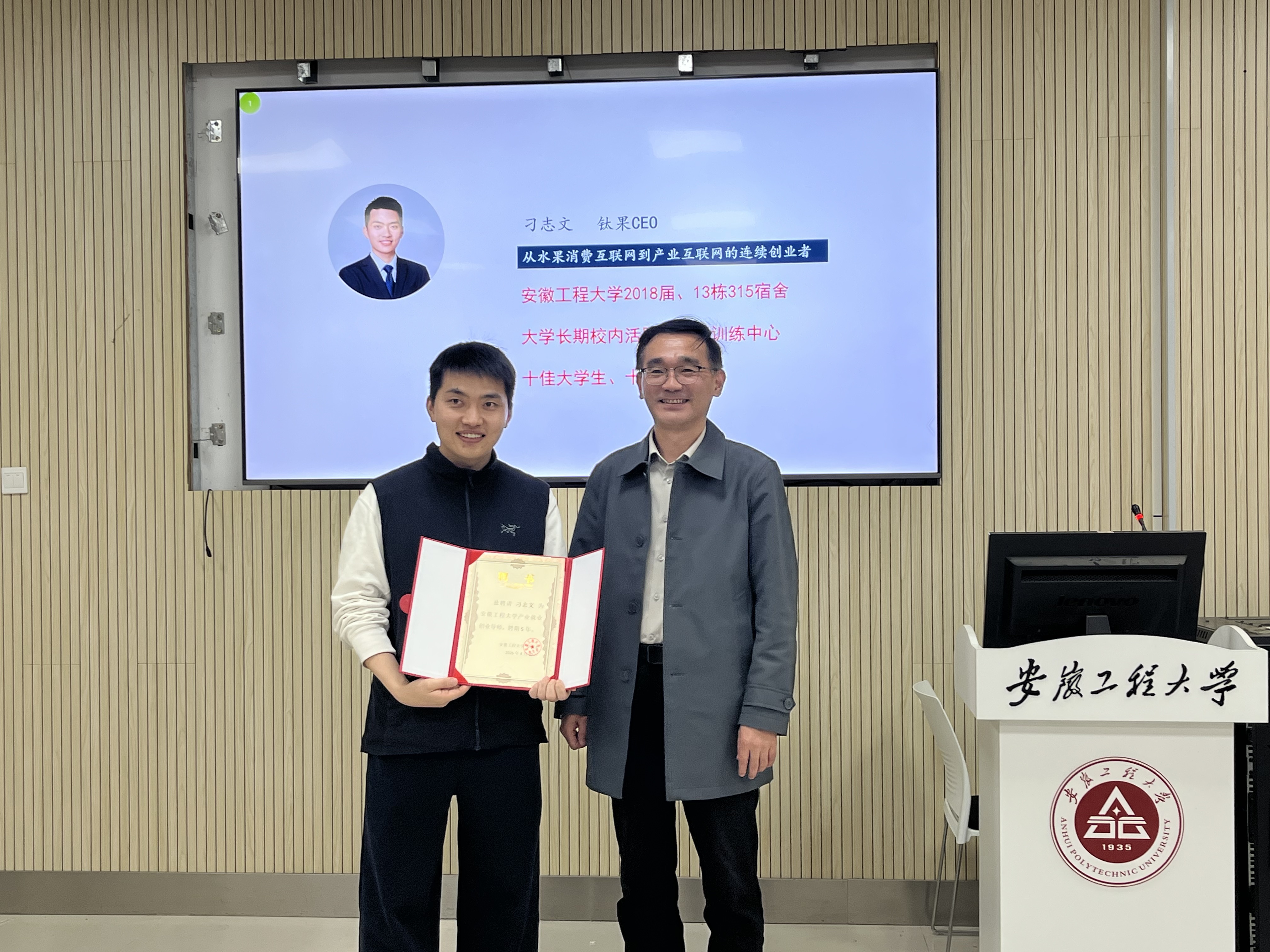 刁志文校友在校期间便展现出突出的创业才能,先后创立高校商店、“果鲜疯”等校园创业项目,荣获“安徽省十佳大学生”“安徽省创业之星”等多项荣誉。毕业后,他深耕供应链与信息技术领域,创办南京钛果供应链信息技术服务有限公司,专注于智慧供应链解决方案研发与落地,凭借创新模式与专业服务在行业内取得优异成绩。
