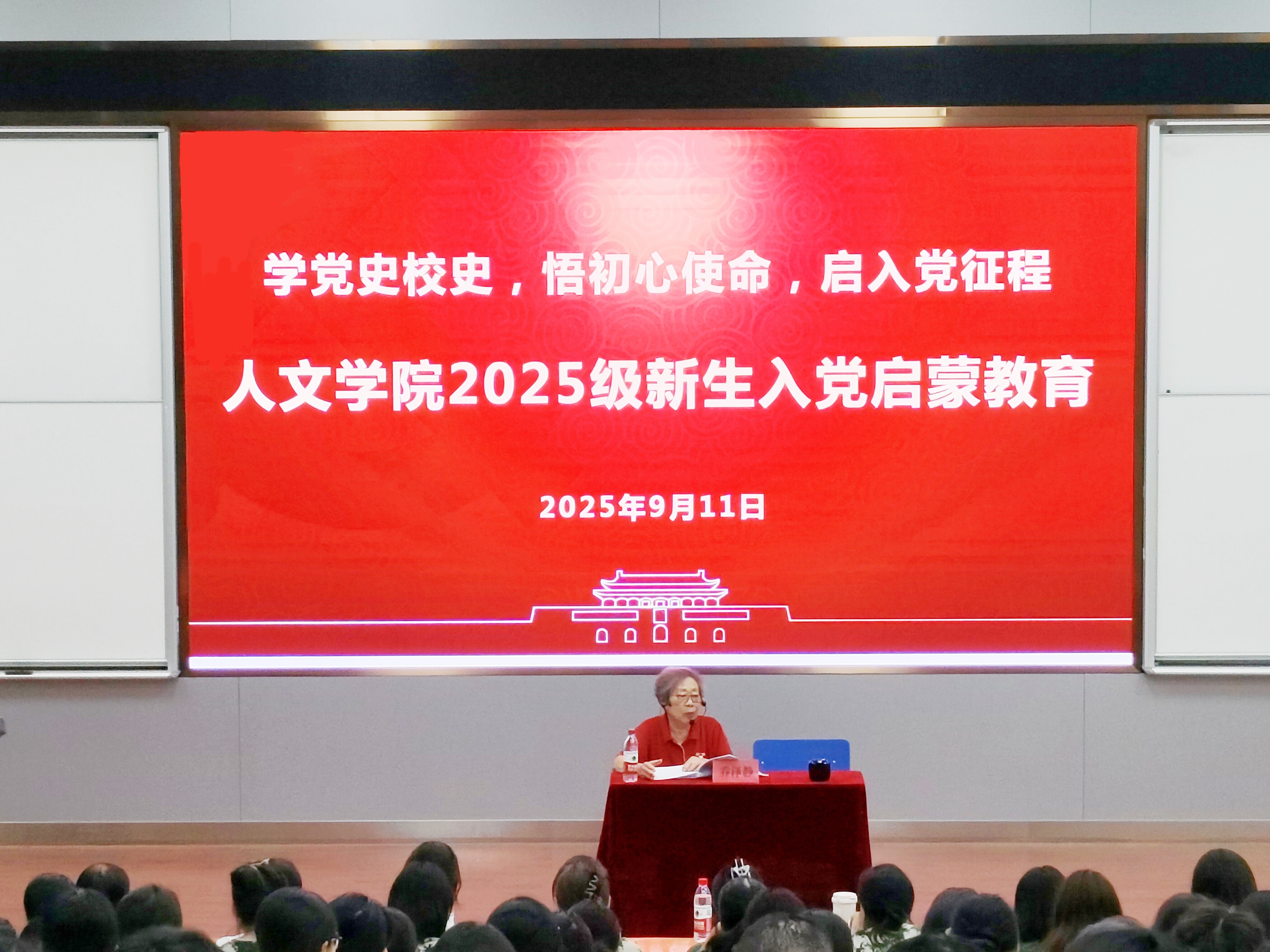 为深入学习贯彻党的二十大、二十届三中全会精神,加强对广大青年的理想信念教育,深化对党的认识、厚植爱党爱国爱校情怀,扣好大学的“第一粒扣子”,9月11日,人文学院面向全体新生开展以“学党史校史,悟初心使命,启入党征程”为主题的入党启蒙教育活动,为新生们开启了一堂兼具思想深度与情感温度的“初心第一课”。离退休党委委员、校园文化传承工作室负责人、原体育学院党总支书记乔泽静受邀开展专题讲座,人文学院党委副书记余本祺出席活动。