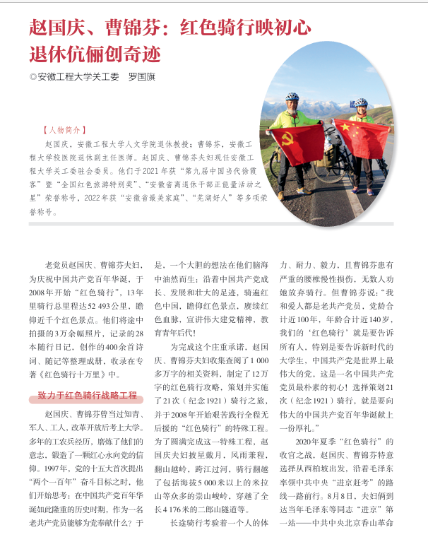 文章从赵国庆、曹锦芬“致力于红色骑行战略工程”“致力于关爱下一代工程”“致力于大思政教育工程”三个层面讲述了赵国庆曹锦芬红色骑行13年10万里壮举,归程后致力于宣讲伟大建党精神,引导青年师生赓续红色血脉、传承红色文化的事迹。如今,赵国庆曹锦芬年届七旬,仍然奔波在宣讲弘扬伟大建党精神,推广红色文化融入乡村振兴的路上,正如他们所说“想把赓续红色血脉、关心关爱下一代当作毕生的事业”。