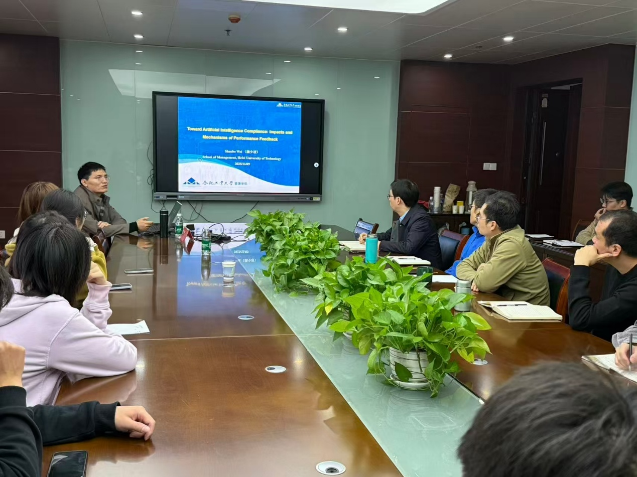 为提升我院师生科研素养,开阔学术视野,11月9日下午,合肥工业大学博士生导师魏少波教授应邀在经济与管理学院C818会议室作题为《Toward Artificial Intelligence Compliance: Impacts and Mechanisms of Performance Feedback》的专题学术报告,学院部分教师及研究生参加此次学术活动。报告会由学院副院长张云丰主持。