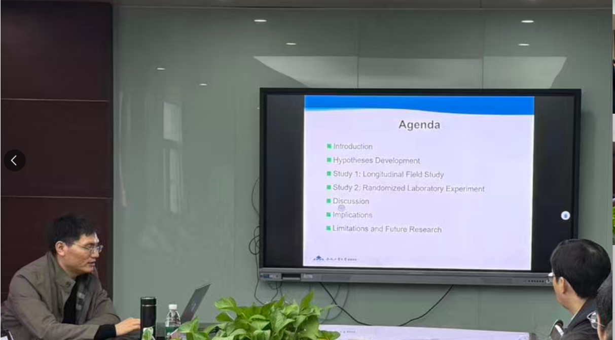 魏少波围绕论文引言、研究假设、研究设计、讨论分析及实践启示等核心模块系统讲解。他指出,当前企业AI应用日趋广泛,但员工违规使用问题突出,传统合规管理方式难以适配AI技术特性。基于反馈干预理论,其团队通过纵向实地追踪与随机实验室实验双重验证:正面绩效反馈可通过强化任务动机与学习过程提升员工AI合规性,负面反馈则会抑制合规行为;而“AI 身份”呈“双刃剑”效应,会放大两类反馈的影响。他同时给出实践建议,企业可通过精准绩效反馈、分层管理员工AI身份优化合规管理。此外,他结合自身写作与投稿经验,建议研究生在求学初期便确立高层次学术目标,在学习中明晰自身需求,扎实度过三年研究生生涯。随后,他与现场师生展开深入的互动交流。
