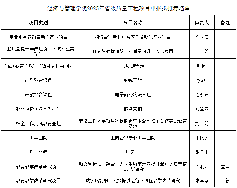 根据教务处《关于开展2025年度省级本科质量工程项目推荐工作的通知》要求,现将经济与管理学院2025年省级质量工程项目申报名单公示如下: