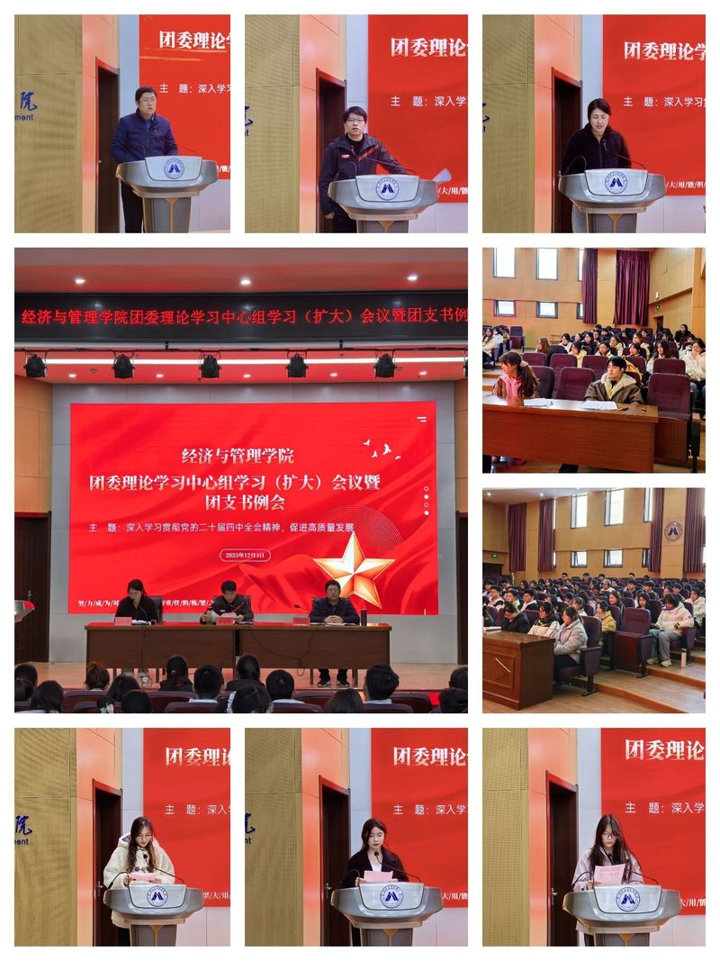 为深入学习贯彻党的二十届四中全会精神,切实把思想和行动统一到党中央决策部署上来,经济与管理学院于2025年12月3日16:00在C座7楼报告厅召开团委理论学习中心组学习(扩大)会议暨团支书例会。学院党委书记水心宝、党委副书记刘海涛、院团委理论学习中心组成员及各团支部团支书、副团支书、社团团支书120余人共同参加会议。会议由学院团委书记赵恒梅主持。