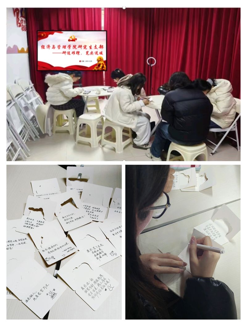 12月9日,经济与管理学院研究生党支部走进女5栋102室学生社区,举办了一场以“研途璀璨,笔尖送暖”主题党日活动。党员同志们亲手书写贺卡,为即将奔赴考场的考研、考博学子送去温暖祝福,以实际行动践行共产党员的初心使命,以真挚情怀传递党组织的深切关怀。