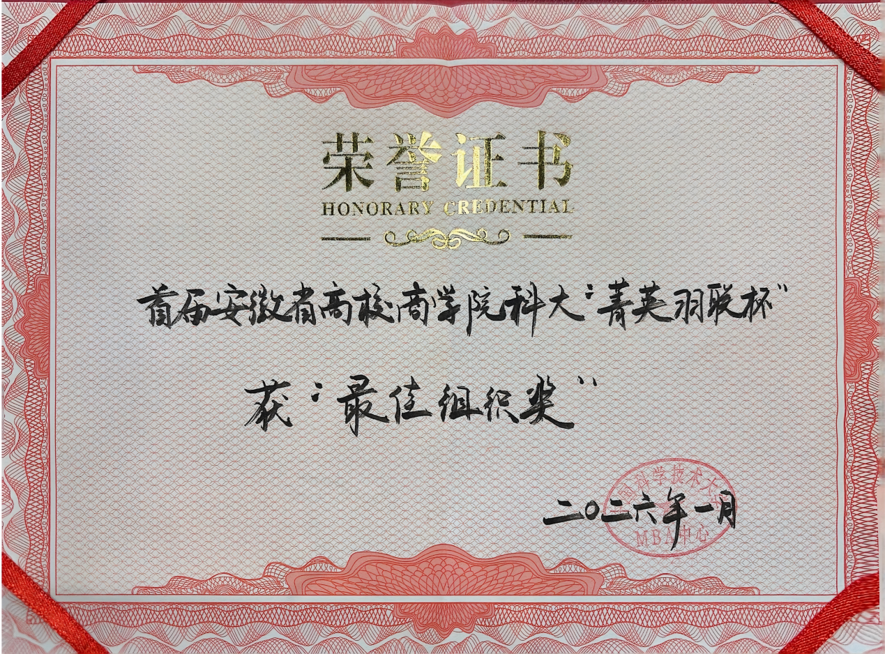 挥拍逐梦,羽你同行。2026年1月2日,首届安徽省高校商学院羽毛球交流赛——“科大菁英羽联杯”在中国科学技术大学国际金融研究院体育馆圆满落幕。我校MBA羽毛球队团结协作、顽强拼搏,最终斩获第五名的佳绩并荣获“最佳组织奖”。