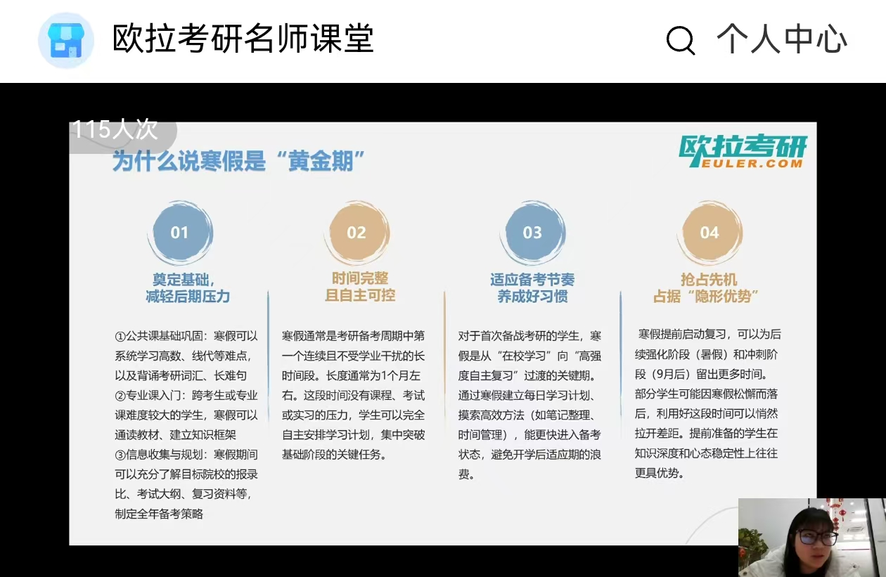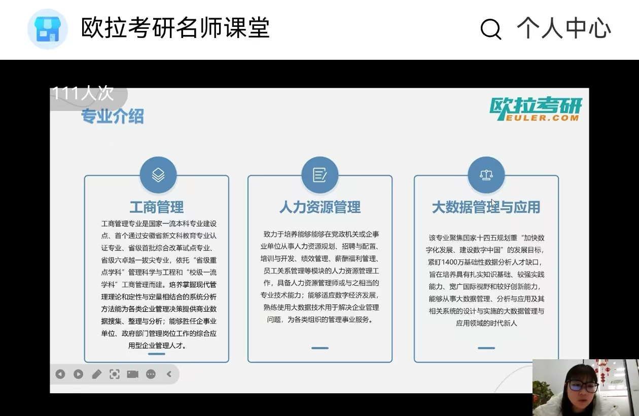 为帮助工商管理、人力资源管理和大数据管理与应用三个专业的同学们更早更好地了解考研形势、明确备考方向和做好考研规划,2026年1月11日晚上7点,经济与管理学院与校企合作单位欧拉考研联合举办了线上“经济与管理学院考研专场分析会”。本次讲座由欧拉考研规划师殷雯庆老师主讲,借助小鹅通平台向大三学子全面解读考研形势、择校策略和复习规划。